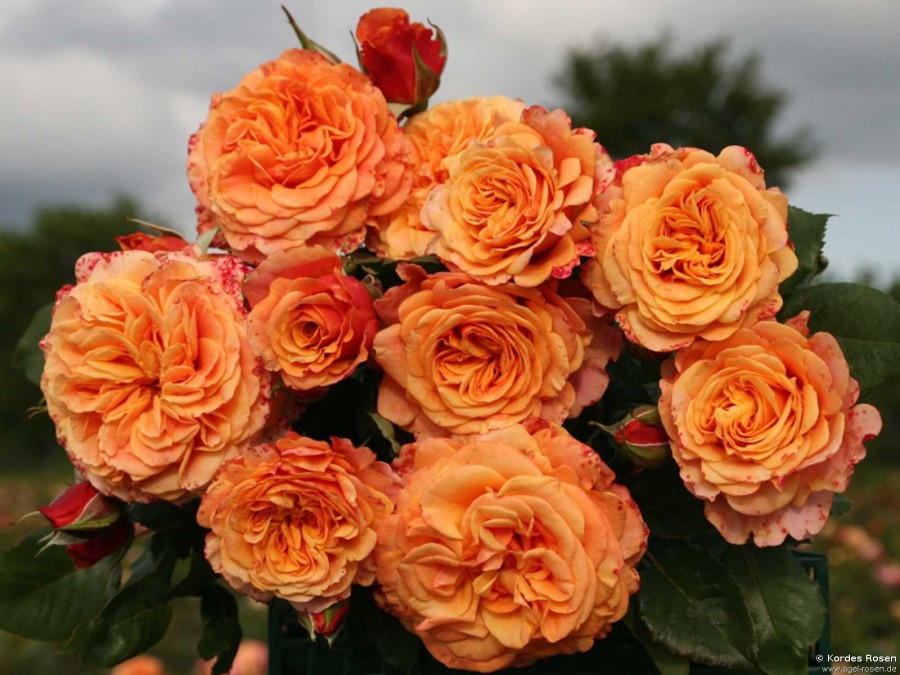Новинка 2013 года. Цветы абрикосово-оранжевые шарообразные, собраны в небольшие соцветия. Крепкий, пряморастущий куст.