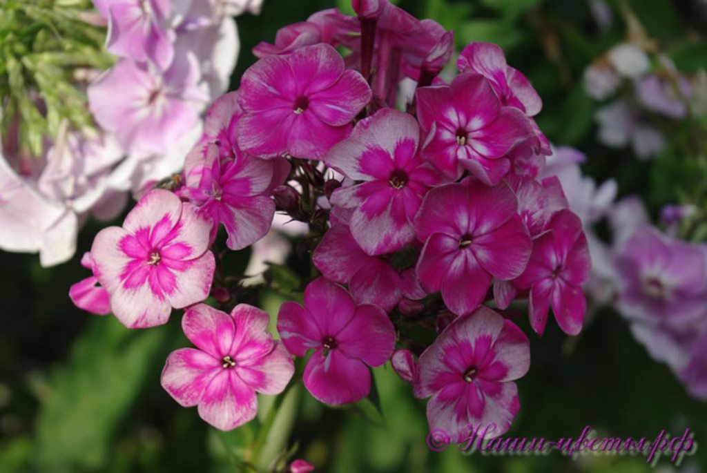 ффектный сорт. Цветок среднего размера, вначале фиолетово-пурпурный с белой звездой в центре, затем серебристо-дымчатый с фиолетово-пурпурной звёздочкой, не выгорает. Соцветие округло-коническое, большое, ветвистое. Куст компактный, мощный, высотой 65-70 см. Стебли прочные. Цветение обильное, в средние сроки.