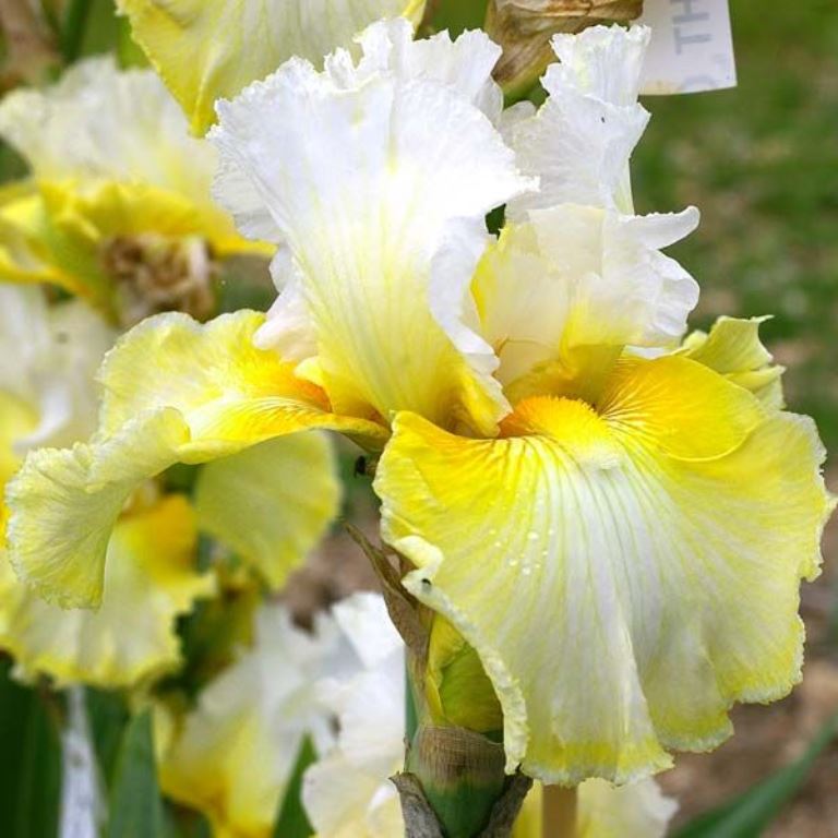 Стандарты белые с золотисто-жёлтой основой и тонкими золотистыми прожилками. Фолы белые с лимонными основаниями, от бородки к краям идут декоративные золотистые прожилки. Бородка яркая лимонно-жёлтая, в основе - белая. Стебли красивые, с 11-13 бутонами в среднем. Листва здоровая. Идеальное растение для сада с очень мягкими цветовыми тонами.