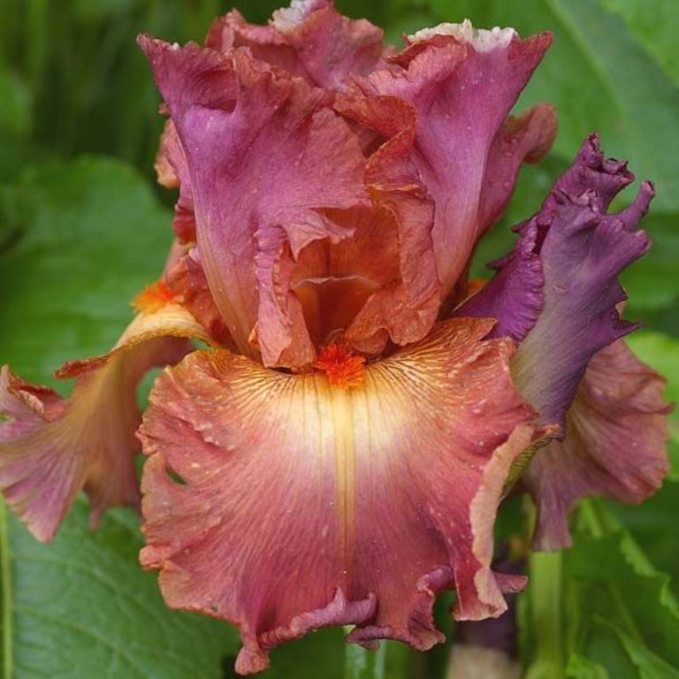 Не просто описать этот цвет, колеблющийся между мягким амарантово-розовым и светлым красно-клубничным, бледнеющим вокруг мандариновой бородки. Цветки хорошего размера, великолепной формы, пышные, с волнистыми краями. Цветоносы качественные, держат в среднем 9-10 бутонов.