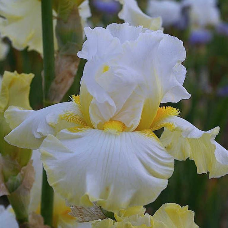Цветки очень крупные, величественные. Стандарты белые, тонированные нежно-жёлтым в основе. Фолы бело-кремовые, по краям скромно тонированные нежно-жёлтым. Бородка золотисто-жёлтая. Лепестки плотные, гофрированные. Цветоносы первоклассные, на каждом в среднем по 9-10 красивых лимонно-жёлтых бутонов.