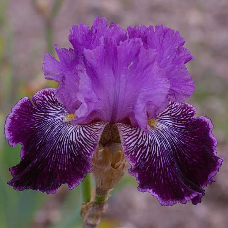 Стандарты сиреневые или лавандово-розовые. Фолы тёмно-фиолетовые с мелкими белыми лучиками и бледной розовато-лавандовой каймой шириной 2 мм. Бородка белая с мандариновыми кончиками. Гофрированный.