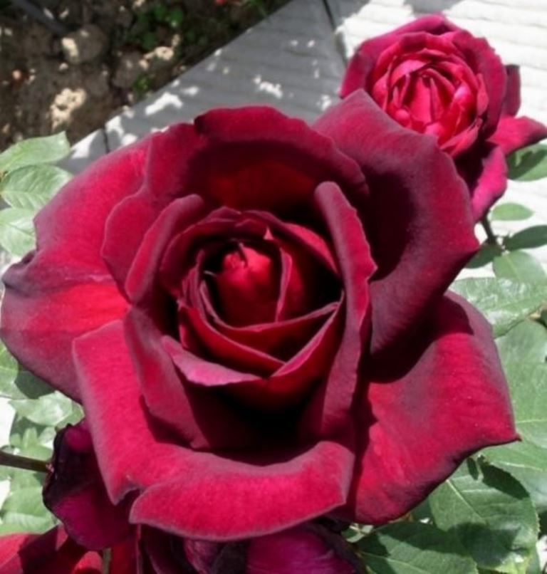Цветки глубокого темно-красного оттенка, средне-махровые, с сильным ароматом, классической формы чайно-гибридной розы с плоским центром, в полном роспуске свободной чашевидной формы, на побегах одиночные. Листва средне-зеленая, матовая.