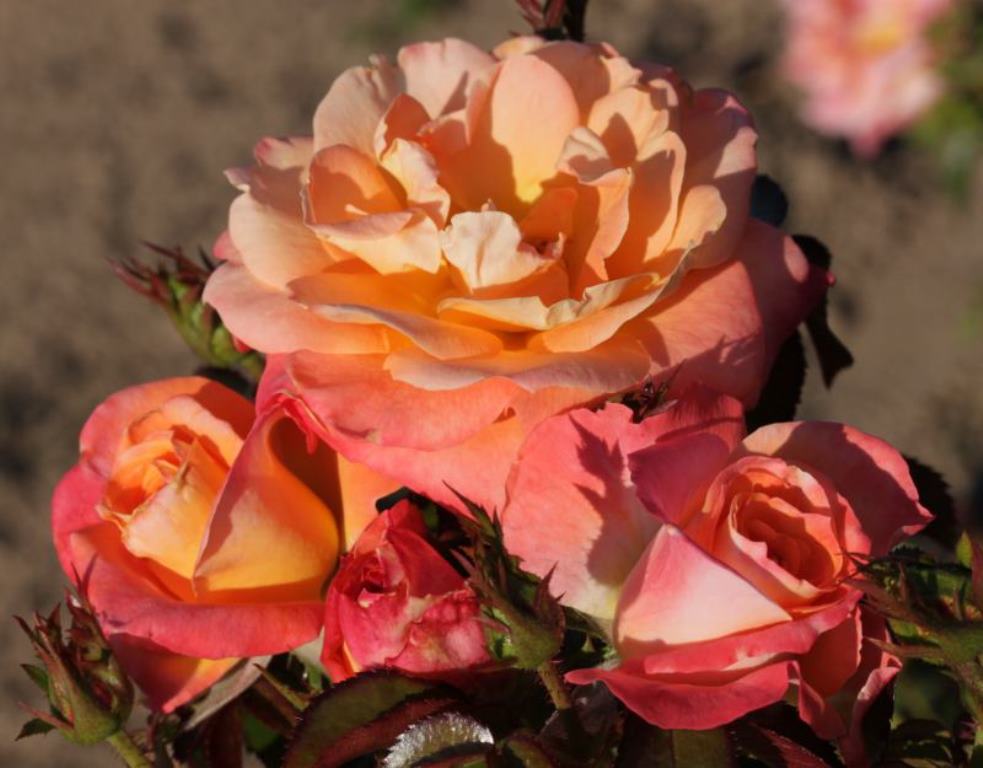 Саженец в первый год нарос хорошо, набрал много бутонов. Пока больше в ширину, чем в высоту. Цветки не крупные. Листья без болячек. В последней стадии цветения цветок резко меняет окраску. Описание цвета: лососево-оранжевый с золотисто-желтыми тенями и розовым оттенком - дает helpmefind.com.Продолжаю следить за этой новинкой. Удивлена полному равнодушию цветков к осенним дождям. Растущий на заднем плане Westerland выглядит довольно грустным в сравнении с этой жизнерадостной розочкой.