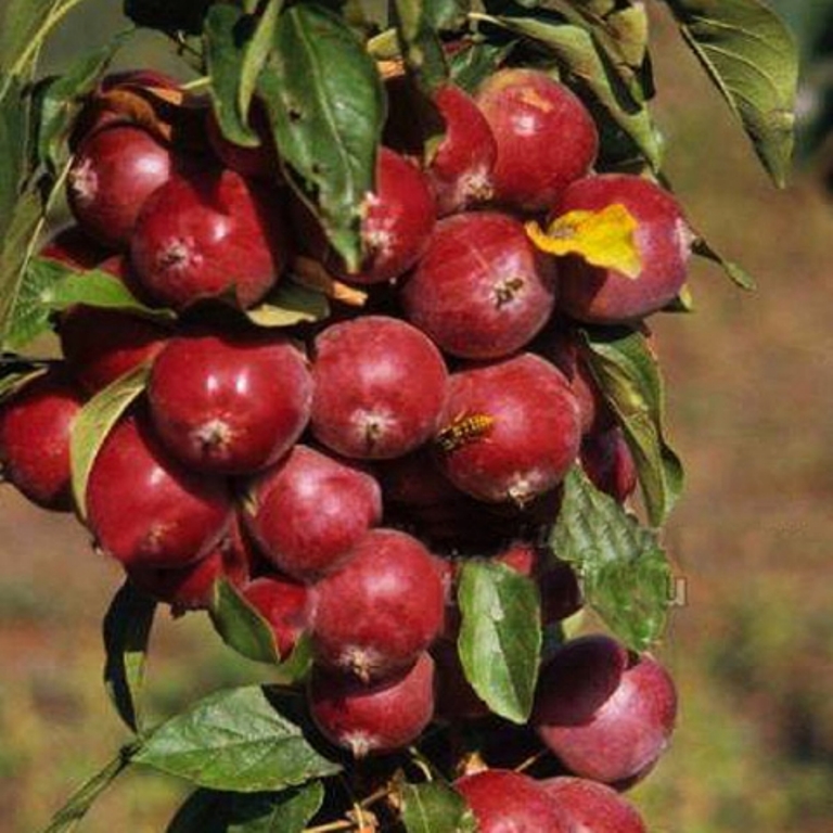 Сильнорослая колонна декоративного назначения. В возрасте 5-ти лет высота дерева от 1.8 до 2 м. Цветы крупные лиловой окраски. Цветет в средние сроки. Сила прироста на 5-ый год 30-35 см., ветвистости нет. Оголений ствола нет. Обильно плодоносит (5 баллов). Плоды малиновые, мелкие, немного вытянутые. Средняя масса плода 40-50 гр. Вкус кисло-сладкий, вяжущий. Листовая пластина темно-зелёная с красновато бурым оттенком, красноватым черешком. Лист блестящий.