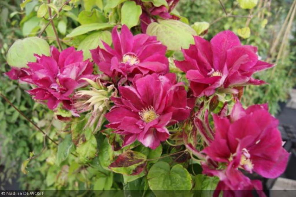 Японский сорт с красными махровыми и полумахровыми цветками диаметром 10-14 см. Чашелистики неправильной формы, широко-ланцетообразные, c волнистыми краями, остро заканчивающиеся, светло-красные с розовой полоской посередине, все более светлые в направлении основания, с зелеными тенями, наиболее заметными на наружных лепестках. Тычинки с пурпурными пыльниками на кремово-желтых нитях. Цветет во второй половине мая - июне и вновь, но менее обильно, в августе - сентябре. Достигает высоты 1,5-2 м. За опоры цепляется листовыми черешками. Используется для выращивания у оград, беседок, решеток, колышков и других садовых опор. Может карабкаться по натуральным опорам, например, лиственным либо хвойным кустарникам, а также полукустарникам, не требующим сильной обрезки. Любит солнечные места.