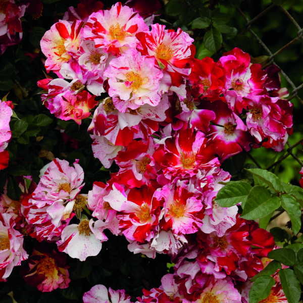 Взрывной, сногсшибательный цвет у этой ароматной плетистой розы. Цветки диаметром 5 см, полумахровые (до 15 лепестков), с карминно-розовыми и кремовыми полосами и пятнами, в соцветиях. Аромат свеженарезанного яблока и розы. Цветение повторное, почти непрерывное, уже в первый год после посадки. Листва блестящая, зелёная. Кусты мощные, высотой 360-420 см, хорошо приспособлены к холодному климату.